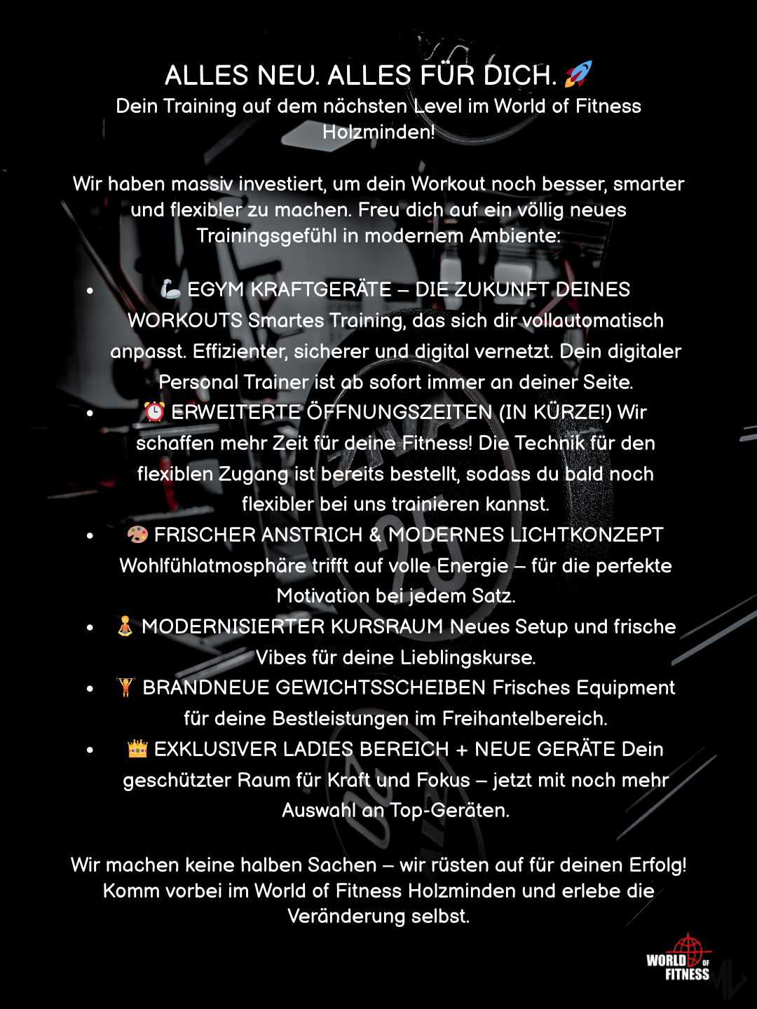 Wir haben massiv investiert, um dein Workout noch besser, smarter und flexibler zu machen. Freu dich auf ein völlig neues Trainingsgefühl in modernem Ambiente. Wir haben die Erweiterung und den Umbau für Anfang 2026 geplant! (Mehr Informationen)